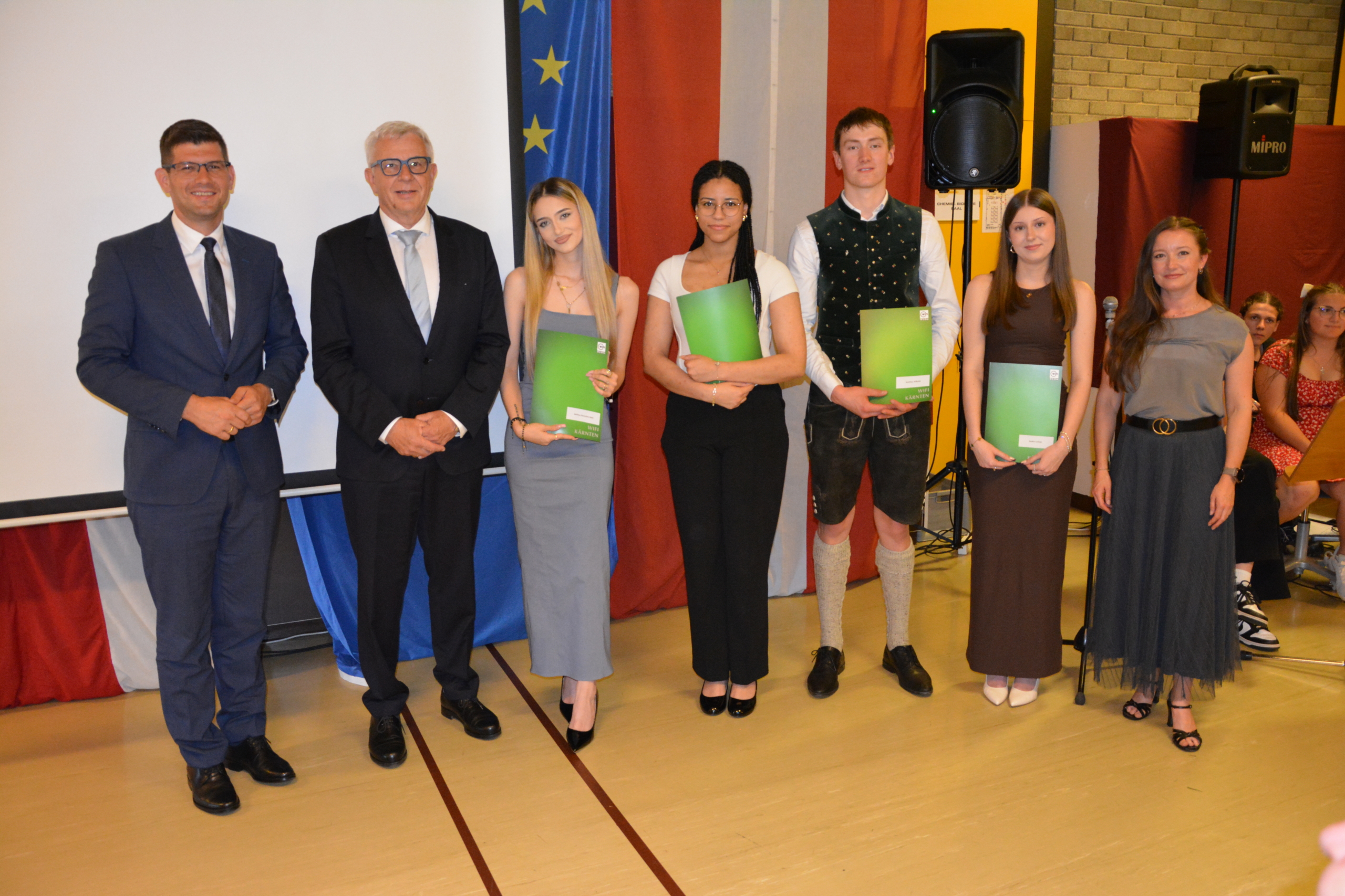 Nach Übergabe der Reife- und Diplomprüfungszeugnisse durch Clusterleiter Mag. Hannes Scherzer und die Klassenvorständ:innen Mag. Werner Probst (5A – Business-HAK), Mag. Barbara Rattenberger (5C – Agrar-HAK) und Mag. Stella Winkler (5E – Industrie-HAK) an die Maturantinnen und Maturanten wurde gemeinsam mit Eltern, Freund:innen, Vertreter:innen der Patenfirmen, des Elternvereins und der gesamten Schulgemeinschaft auf die herausragenden Leistungen angestoßen.