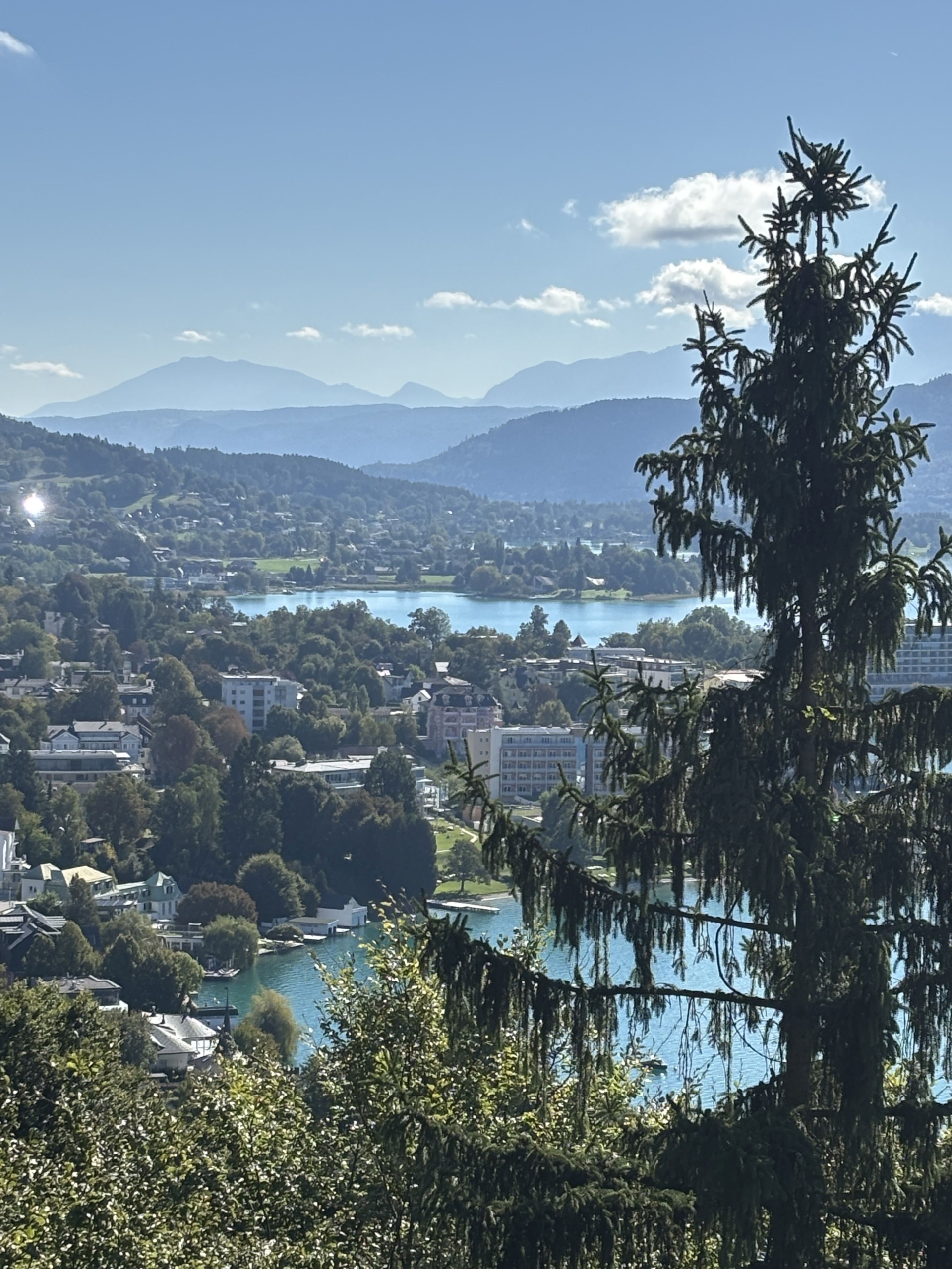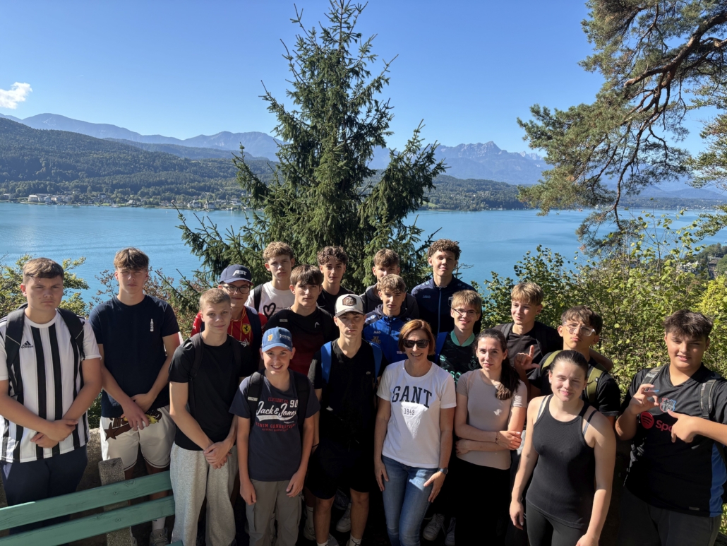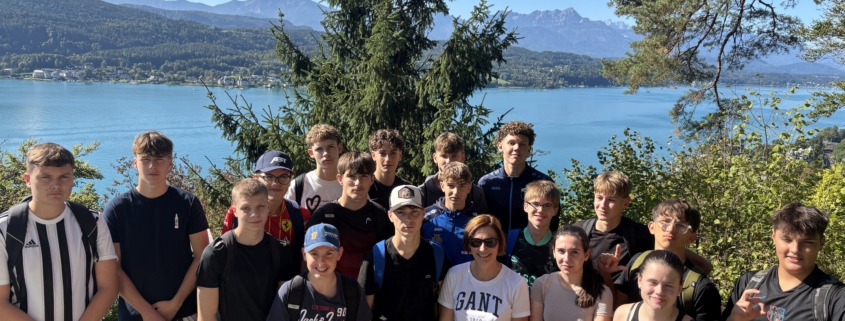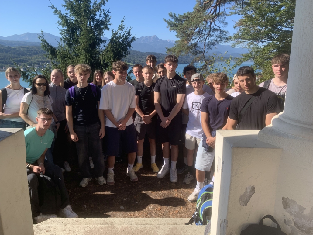 Treffpunkt war bereits um 7:15 Uhr am Bahnhof in Treibach-Althofen. Von dort ging es mit dem Zug Richtung Krumpendorf, wo wir um 8:13 Uhr ankamen. Motiviert marschierten alle 39 Schülerinnen und Schüler, die beiden Klassen waren vollzählig, bei strahlendem Wetter Richtung Pörtschach. Kurz vor 10 Uhr kamen wir dort an und holten uns in den Supermärkten eine Stärkung. Doch viel Zeit zum Pausieren blieb uns nicht, wollten wir doch noch die Aussicht auf der Hohen Gloriette genießen. Der Aufstieg dorthin dauerte ca. 30 Minuten und führte uns auf einem schmalen Wanderweg durch den Wald. Mit einem herrlichen Panorama mit Blick auf den Wörthersee und den Pyramidenkogel wurden wir belohnt.