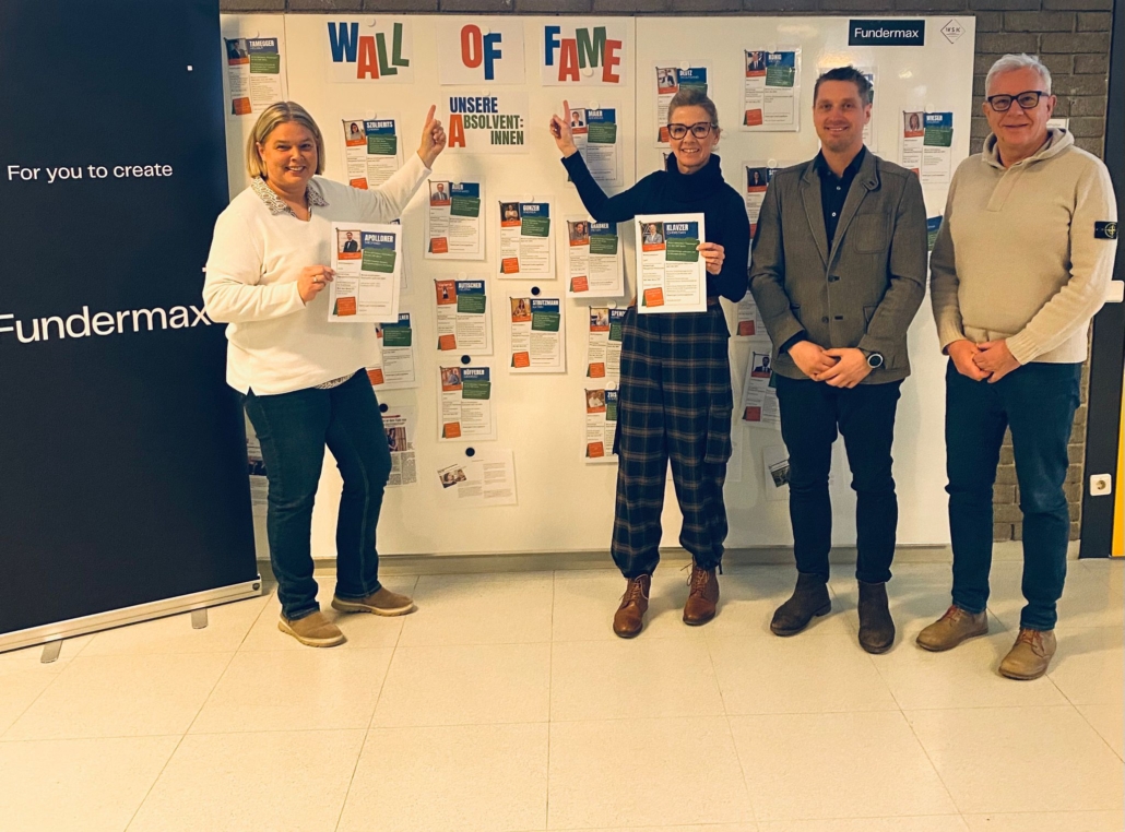 Ein herzliches Dankeschön ergeht an unsere Patenfirma Fundermax für das großzügige Sponsoring der hochwertigen Hochglanz-Magnettafel, die unsere Absolvent:innen ins rechte Licht rückt – ebenso ein großes Dankeschön an die WSK Schwarzl Möbelmanufaktur für die professionelle Belegung der magnethaftenden HPL-Schichtstoffplatten.