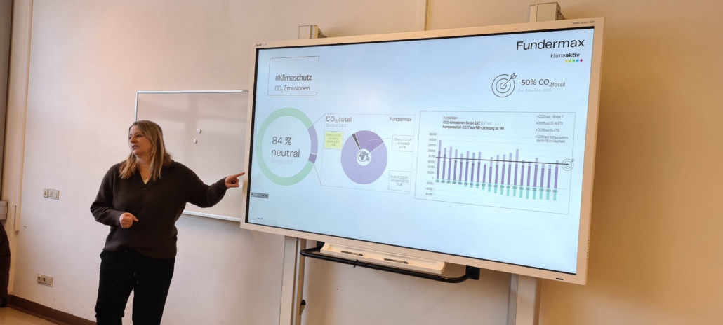 Zuerst gab die Expertin einen Input in den Green Deal des Unternehmens: Fundermax setzt seit über 20 Jahren auf ein umfassendes Umwelt- und Energiemanagement nach ISO-Standard und integriert Nachhaltigkeit in alle Unternehmensprozesse. Das Unternehmen nutzt Holz zu 100 % aus zertifiziert nachhaltiger Forstwirtschaft und folgt dem Prinzip der kaskadischen Nutzung – erst stofflich, dann energetisch. An den Standorten St. Veit, Neudörfl und Wiener Neustadt erzeugt Fundermax Öko-Energie durch Kraft-Wärme-Kopplung und Photovoltaik und versorgt etwa 10.000 Haushalte mit Fernwärme aus Abwärme. 80 % des Energiebedarfs stammen bereits aus erneuerbaren Quellen, und das Ziel ist, die verbleibenden fossilen CO₂-Emissionen um 50 % zu reduzieren. Damit leistet Fundermax einen wichtigen Beitrag zum Klimaschutz, zur Ressourceneffizienz und zur regionalen Energiewende.
