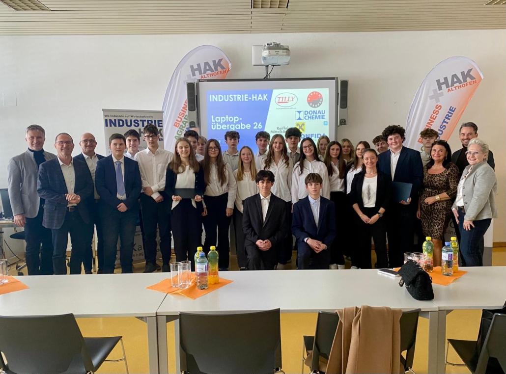 Ein starkes Zeichen für Bildungskooperation und regionale Verantwortung setzten kürzlich mehrere Patenfirmen bei der offiziellen Laptopübergabe an der Industrie-HAK Althofen. Dank ihres Sponsorings können die Schüler:innen der Industrie-HAK ab sofort digital arbeiten und werden gezielt auf die Anforderungen der modernen Arbeitswelt vorbereitet.
