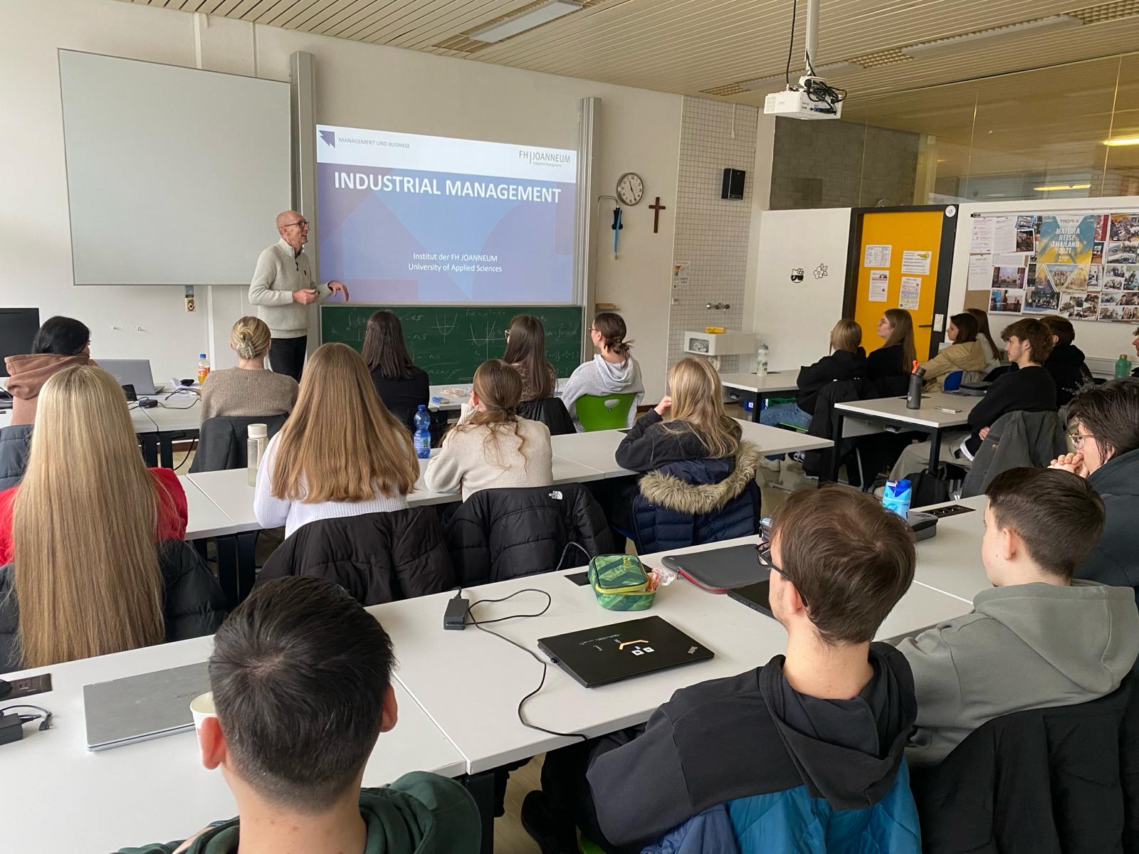 Die Klasse 4AE der HAK Althofen erhielt kürzlich Besuch von Herrn Peßl von der FH Joanneum Kapfenberg, der den Schülerinnen und Schülern das Bachelor- und Masterstudium Industrial Management vorstellte. Das Studium verbindet Betriebswirtschaft mit Technik und gilt als besonders attraktive Option für Schülerinnen und Schüler der Industrie-HAK, die sich für eine praxisnahe akademische Ausbildung interessieren.