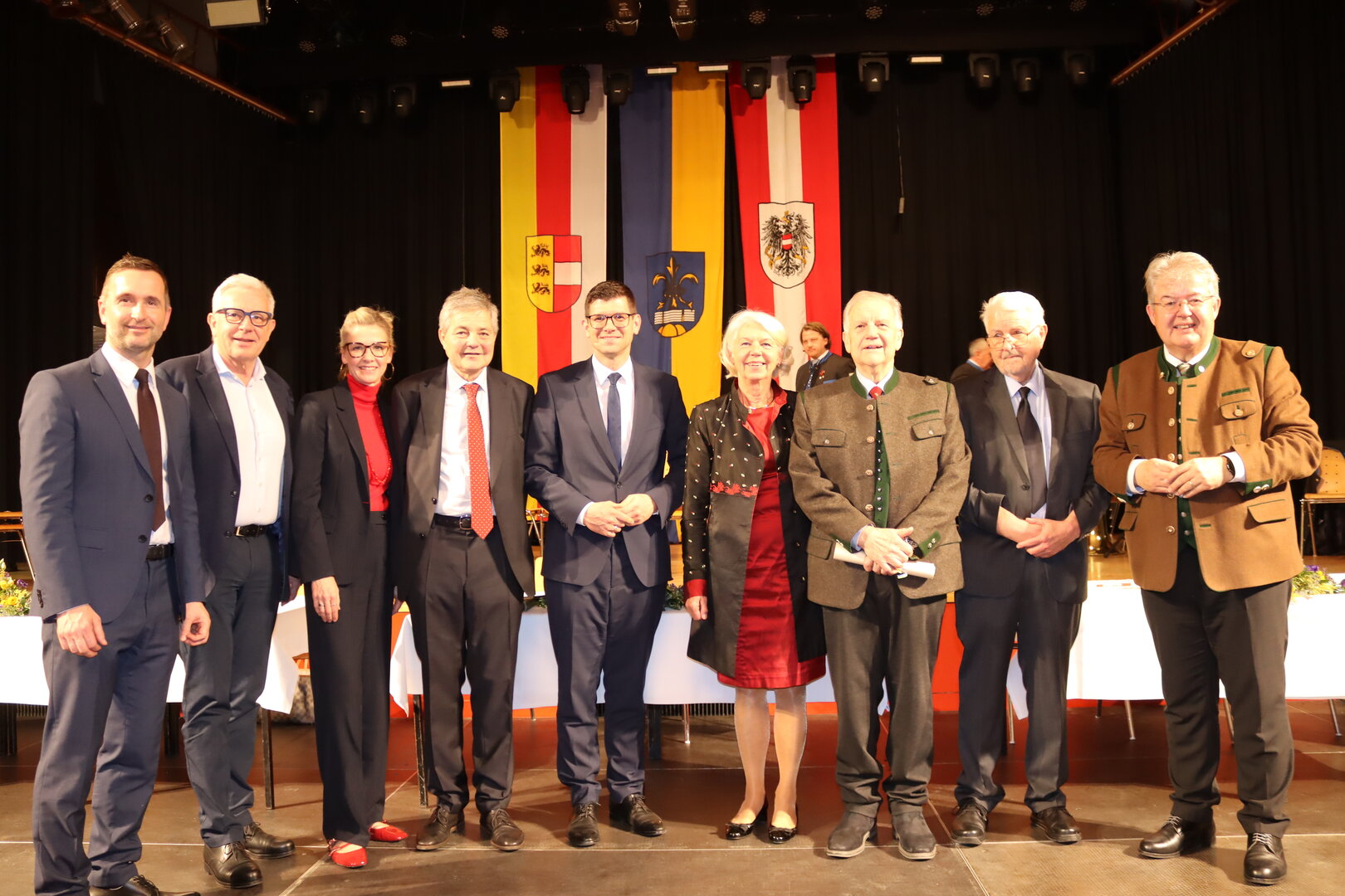Foto v.l.n.r.: Michael Baumgartner, Dir. Hannes Scherzer, Marlene Brunner-Wogrin, Siegbert Schönfelder, Landeshauptmannstellvertreter Martin Gruber, Melitta Huber, Manfred Skalka, Günther Zenkl, Bgm. Walter Zemrosser