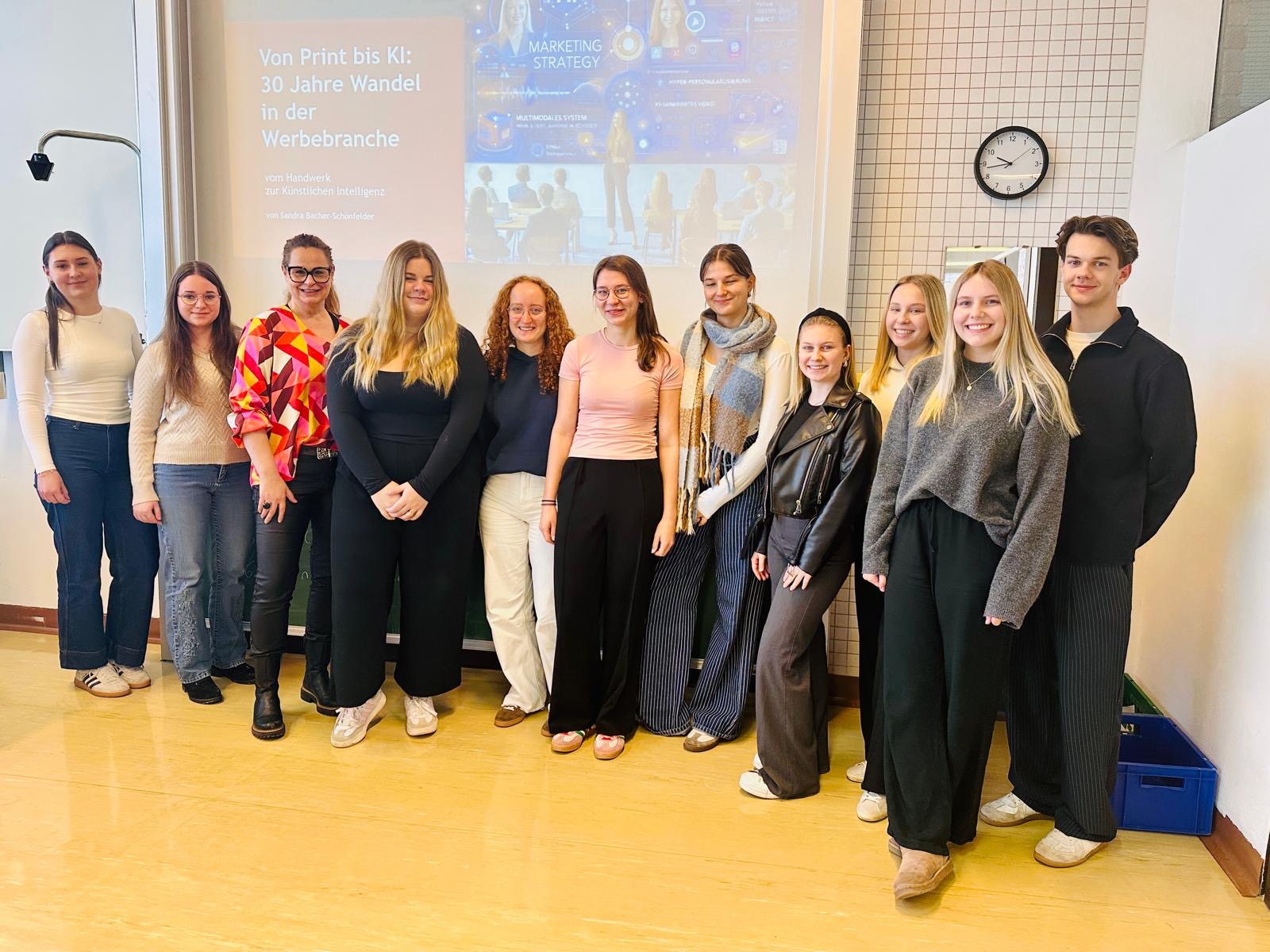Die Schülerinnen und Schüler der 5 A hatten im Rahmen des KMMA-Unterrichts die Möglichkeit, Einblicke in die Arbeit der Werbebranche zu bekommen. Frau Sandra Bacher Schönfelder, Grafikdesignerin, zeigte anschaulich auf, wie sich die Arbeit in Werbeagenturen geändert hat und wie die künstliche Intelligenz in dieser Branche Fuß gefasst hat. Ihre abschließenden Tipps für das Arbeiten in diesem Berufsfeld waren: „Habt ein gewisses technisches Verständnis, seid kreativ, versteht die KI und benutzt sie nicht nur, denkt strategisch, lernt ein Leben lang!“