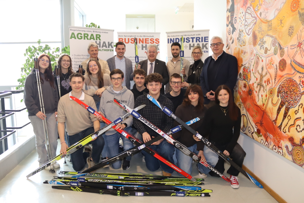 Die HAK Althofen freut sich über die Übergabe neuer Langlaufausrüstung durch Bürgermeister Walter Zemrosser und Sportstadtrat Philipp Strutz. Insgesamt konnten 19 Paar Langlaufski mit Stöcken sowie zahlreiche Schuhe aus dem kostengünstigen Bestand einer Langlaufschule angekauft werden. Die Organisation und Verhandlung übernahm Dietmar Trampitsch.