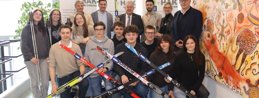 Die HAK Althofen freut sich über die Übergabe neuer Langlaufausrüstung durch Bürgermeister Walter Zemrosser und Sportstadtrat Philipp Strutz. Insgesamt konnten 19 Paar Langlaufski mit Stöcken sowie zahlreiche Schuhe aus dem kostengünstigen Bestand einer Langlaufschule angekauft werden. Die Organisation und Verhandlung übernahm Dietmar Trampitsch.